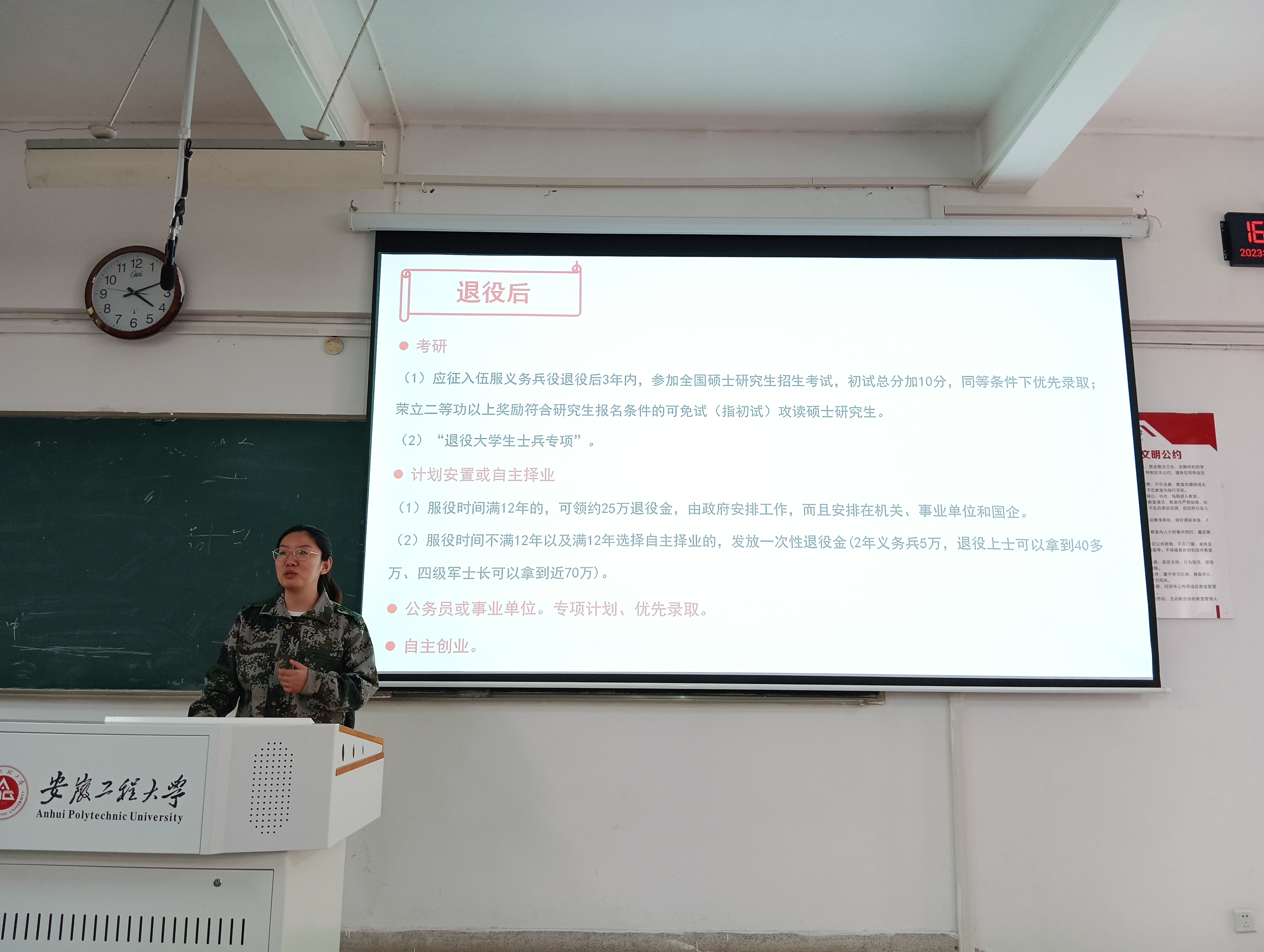 为深入学习宣传贯彻习近平强军思想,进一步做好征兵政策宣传,激发人文学子参军入伍积极性,推动学院高质量就业,4月19日,人文学院在6J112召开2023年度(春季)征兵宣传动员暨就业推进会。校党委武装部(征兵工作站)赵成婧老师应邀为学院做征兵政策解读,社工专业研究生王九香和法学专业董云翔两位退役大学生士兵做交流分享。2019级、2022级学生参加,会议由毕业班辅导员范夏勋主持。